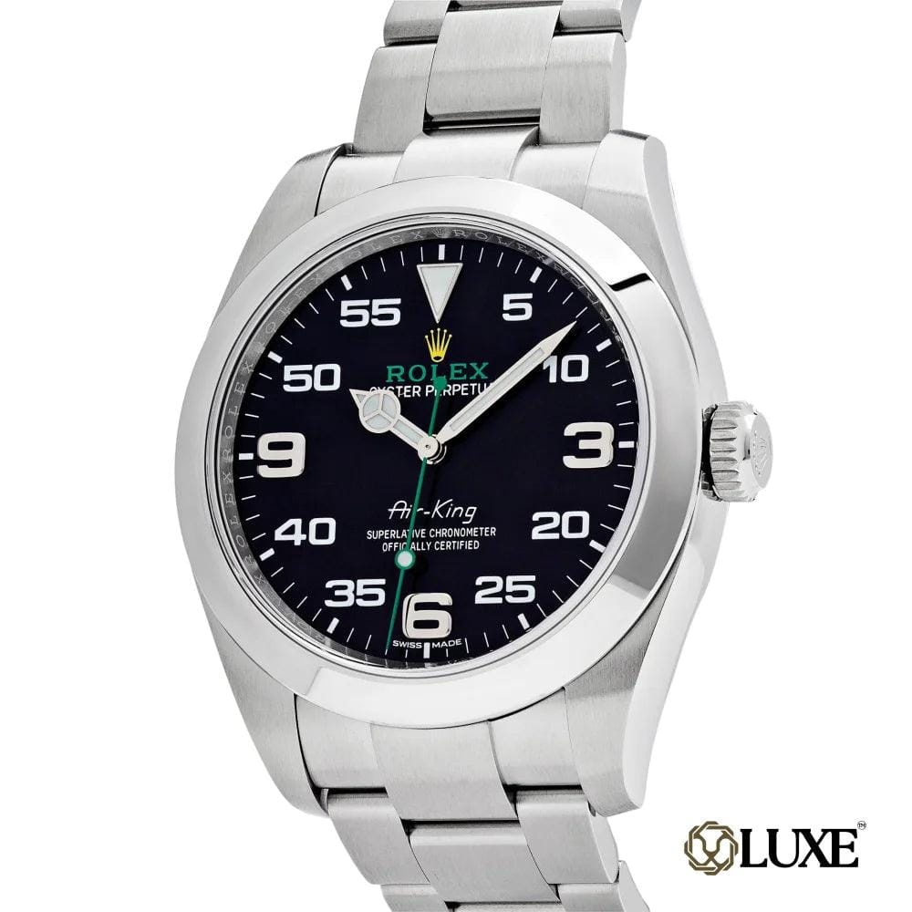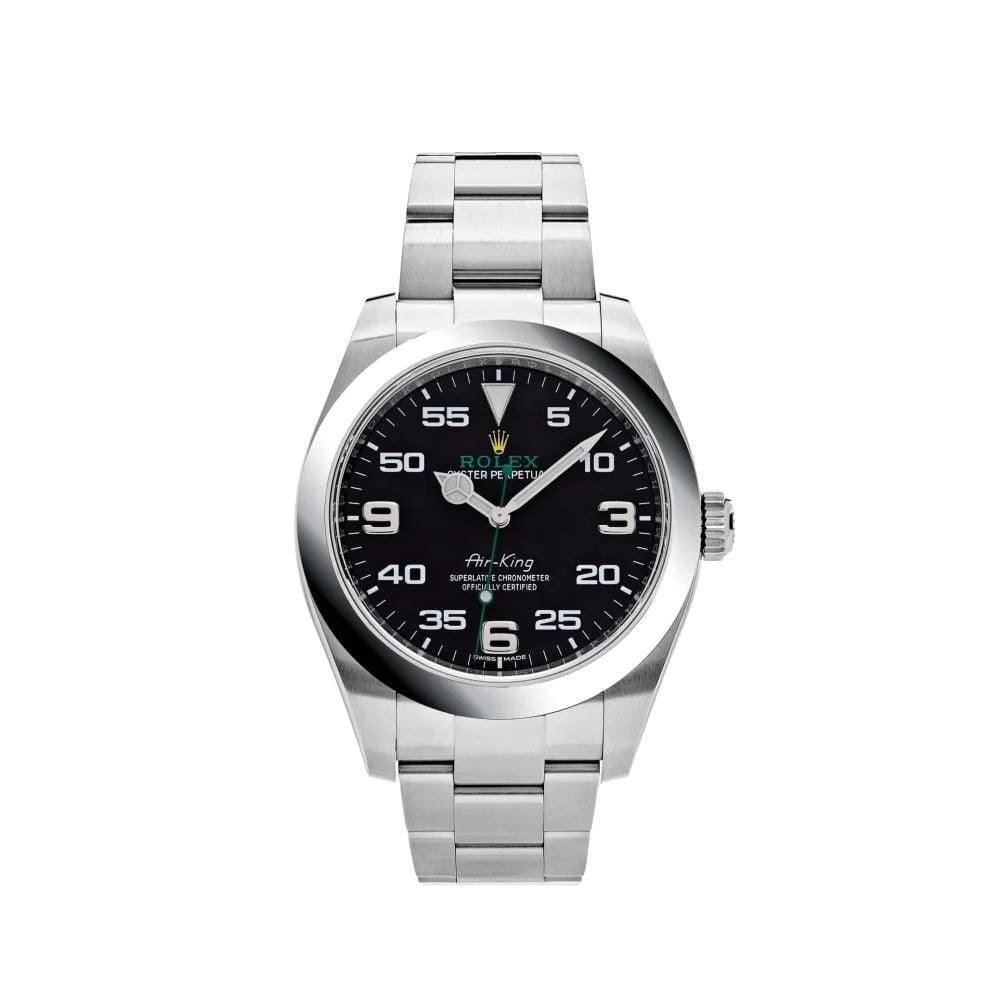 Le nom Air-King est gravé en son centre entouré de chiffres et d’aiguilles blancs lumineux. Cette montre-bracelet solide est logée sur un bracelet Oyster exquis avec des maillons plats en trois parties.